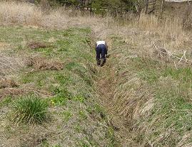 せぎ に覆いかぶさった枯れ草を除け、泥を畦道へ上げていきます。