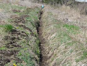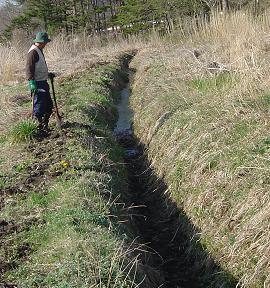 湯川の取水口まで約600m。機械が入れないので、スコップで、せっせと。