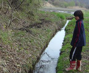 取水まで遡り、水門を開けます。(水門といっても、土嚢と板でせき止めてあるだけですが)