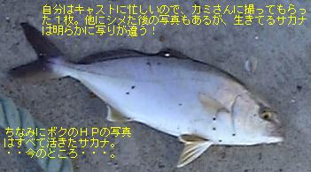 大洗へ海水浴。 そのついでに、大洗港の様子を見に立ち寄った。 炎天下のモト、港には、20cmくらいのサヨリの子が たくさん。 それでもたまりかねて、サビキをはじめちゃう。 クチが小さいのか、誘って誘って、やっと2匹・・・。 港内でボラがハネている・・・。 ・・・・ん?・・・どうも様子がおか しい・・・。 何かが執拗に小魚を追いかけている。 急いでサビキ仕掛けをカミさんと子どもに渡し、シー バスロッドに メタルジグをセット。小魚が逃げ惑っている ところめがけてキャスト。 しかしアタらない。 ビートルナッツの6cm、レッドヘッドに替える。 そして2投目、突如 目の前にナブラ・・・・ それをめがけてキャスト&スピードトゥウィッチ。 すると「ドカーン」(ちょっとオオゲサ)という衝撃と共 にドラグが鳴った。 海で久しぶりの超アタリ!。 やっと岸まで寄せてきて、魚影を確認。 「カンパチだぁ!」 引き味も申し分ない。 ラインは8lb。 なんとか抜き上げる。 28cm。