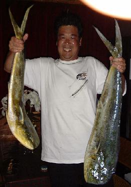 次、そしてその次の群れ。 このとき船中最高の 115Cmが上がった。 取り込むのに15分はかかってた。 まさにお化け! 数個群れを求めうちに船の後ろでキャストしていた僕にヒット! 真っ青のきれ いな魚体がジャンプ! そのとき船長がクラッチを切り、移動しようとした。 「船長、ヒット!!」 その瞬間 ”ブチン” ・・・・・・リーダーごと切れた。 「あぁ、ごめん。もっと早く言ってよォ。」 ・・だって・・・ヒット直前だったんだもん・・・ まぁ、ドラグの調整がアマかった ボクのせいもあるので文句は言うまい。 しかし、あの魚体はきれいだった。 急いでラインシステムを組み直す。 そして、まぁまぁの型がマスターにかかった。 ずいぶんタモ入れに苦労して上がっ た。 タモ入れはEっちゃんだった・・・・。 また移動。ペンペン の嵐。 しかし、ヒットしたときの衝撃はナカナカのもの。 これが実にオモシロイのだ。 ワカシ(20cm)もヒット!! そしてなんだかんだで群れが見えなくなり、TimeUp。 船を下り、荷物整理。 マスターの店まで直行。 3:00PM前には渋谷についていた。 数上げたシイラのうち、2〜3匹をキープ。 さばいてみると、胃からは イワシそして、ワカシが出てきた。 あの船長が言っていた「でかいルアーを使え!」というのは アタっていたのだ。 そして、ムニエル・・・・ウマいんですよ。これが。 うちの子 はバクバク ペロリ でした。 なぜ、みんなリリースしちゃうんでしょうか・・・。 1匹くらいキープして、お土産にすれば、ビールのツマミに ちょうどいいですよ。