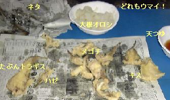 1ヶ月 釣りに行っていない・・・もう、干からびてしまいそうだぁ・・・・ そんななかマスターよりお誘い。 「今度の連休、 佐島でボート釣りして”天ぷら”しよう・・・」 10/6 太平洋上に台風発生!!このままだと 天ぷらに直撃!!! あぁぁ・・。 10/7 曇りの中、息子の運動会は無事終了。 台風も少しソれた! これなら行ける!。 翌8日2:00AM 起床。 佐島へ向けて Let'S Go!。 4:30 佐島・海楽園着。 朝食をとろうと、待ち合い所に入る。 するとテレビがついていて、アメリカの 報復攻撃第1波 を伝えてい た。(トマホーク50発!!!) 一方 日本の三浦、佐島で、僕は お茶すすりながら朝食、一服。一心地つけてるボクいる のであった。 平和あってこそだぁね。 タックルを準備に車に戻る。しばらくするとマスター、ハカリさん到着。 総勢9名。身支度を整え、4隻のボートに乗船。 6:00AM 出船。風は吹いているので、起きには出られない。 僕はハカリさんと同船。 行程10分くらいの岸よりで開始。 ブルブルと微妙なアタリ。 上げてみ ると まるでワカサギのようなピンギス!! ピンギス・・・・・またピンギス・・・。 その後あまりパっとしないので、移動。 そして巨大鳥山発生!!! なぜかルアーが登場!!キャストするが反応 なし・・・・ そこに遊漁船が突っ込んできて見事に鳥山は散った。 ルアーはあえなく惨敗。 底物に戻る。 移動、移動。 メゴチ、トラギス(?) 、チダイ、イイダコそしてハゼ、ハゼ・・・・ キスがなかなかこない・・・・見事な雑魚五目!?!?! ハゼが多い・・・ビミョーなアタリが頻繁にあり、サカナもちっちゃい。 一人でボートに乗っているときと違い、同船者がいる、いろいろ 会話があり、厭きない。 (しかもハカリさんなので・・・) 会話が途切れると、ハカリさんはネムくなってしまうのだ・・・会話・・空歌・・沈黙・ ・・釣り・・・の繰り返し。 カゼも強いし、小雨も降ってきた・・・カッパ持ってきてよかった・・・。 ハゼと遊んでいたら、集合予定時刻の12:00になった。 各船もそろそろ上がるようだ。 餌も半分なくなったのでとりあえず一時帰還。 岸についてハカリさんが無線でTAOさんと交信・・・ するとマスターから無線が入ってきた。 「自衛隊堤防の先で転覆しているボートがある!!」 急いで船屋の人に伝えた。おっちゃんがソッコーで船を出す。 普段愛想のいいおばちゃは真顔になって 「あっちのほうは山がないから吹くんだよね・・・あぶないって言ったのにねぇ ・・」 15分後、 船にボート、お客さんを乗せて戻ってきた。 「無事」でよかったぁ・・。 雨も本降りになって、みんな上がってきた。 天ぷらのために みんな普段はリリースするようなサカナ(どんなんだい??)まで キープしてきた・・・・。 これはどうにかして天ぷらするしかない・・・ 僕のクルマにはタープが常備(?)してある・・・・ 秋谷港に移動して、タープ張って天ぷらすることに決定!!