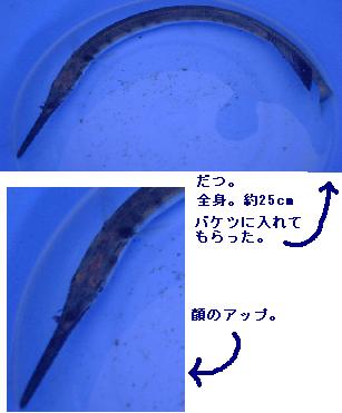 南伊豆滞在最終日。青物に見切りをつけ、メッキなどのライトタックル系 に切り替える・・。 岩地海岸に5:30着・・・駐車スペースがなく海岸の北側に停める。 タックルを準備し、海岸に降りる。キャスト・・・・ 反応なし。 浜にはもう人が「海の家」の準備をしている・・・ 駐車した場所があまり良くなかったので、落ち着かず、早々に引き上げる。 次・・・石部・・・。 すると港の駐車場には既に係員がいて駐車料金を徴収中!! 車を止められず、次・・雲見海岸へ。 国道の脇に駐車し、海岸へ下りる。 浜の中央に流れ込んでいる川に沿って堤防が突き出しており、そこから キャスト開始。チップミノー4cm。 小魚が追ってくる。メジナ・・キタマクラ・・カワハギ・・・ 少し砂浜寄りにキャストしてみる。すると、「パシャ!」と来た。 ダツ!! 約26cm・・・・ 側でノベザオを出していた子のバケツへ移して、撮影・・。 考えてみれば、人生初ダツ! 6:20終了。