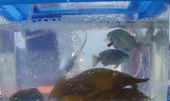 8/7 多々戸 前日夜から伊豆。 いよいよ夏休みスタート!! また南伊豆に長逗留するのだ。 Kさんちと 多々戸浜で落ち合う。 基地を設営。 海に入る前に 浜左手の堤防で、サビキ実行。 エサを撒くと、例によって群れが集まってくる。 一発目はウルメ。 二発目はタカベ。 エサめがけて、少し大きめの青いのが集まってくる。 サバだった・・・・ 次にメジナ。 メジナはカワイイよ。 メジナとタカベを水槽に入れ、基地に戻る。 和み系水槽。
