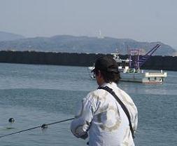 天気は良く、風も温かい。 東京湾観音をバックに釣れない釣り人 & 下洲漁港。