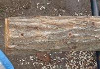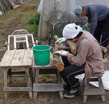ホダ木に、シイタケの菌糸のコマを打ち付けていく。