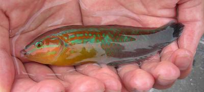 ネンブツダイを頭に、スズメダイ、子イシダイ、子マダイ、キュウセン、ササノハベラ