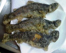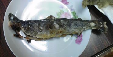 バンメシに一昨日ゲットしたイワナのカラアゲと塩焼き・・。