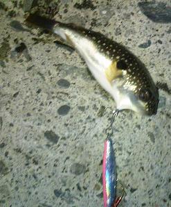 暗くなってから、何やら待望の手応え!フックアップしたのは、フグ・・