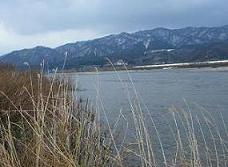 昨日の朝、雪の平原だった河原、雪で真白だった山々は、雪が完全に融け、増水も