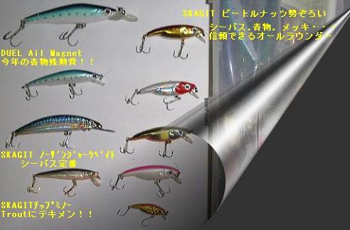 ルアーコレクションのページ HOME 1投1投 期待を込めてキャストするルアー。良い動きをして、多数の(?)ヒットを生むこともあれば、 バラシ、クラッシュ、根がかり、枝、ライン切れ・・・ロストしてしまうものも多数。 んでもって結構高いんですよ、ルアー。。 そんなルアーたちに敬意を込めて、ルアーコレクション。左フレームの製品名をクリックしてね。 釣具のショッピング!! ルアーを安価に購入!